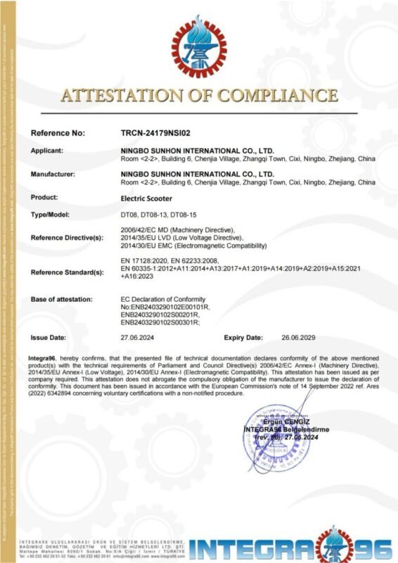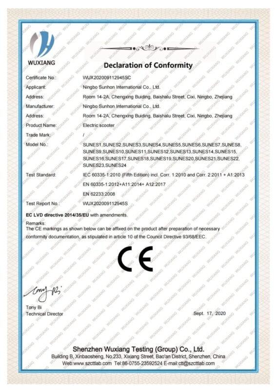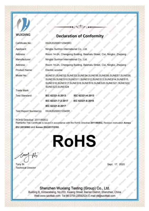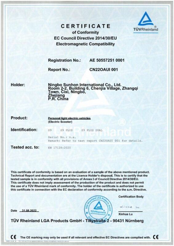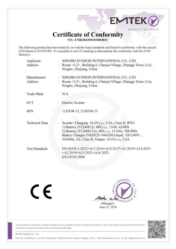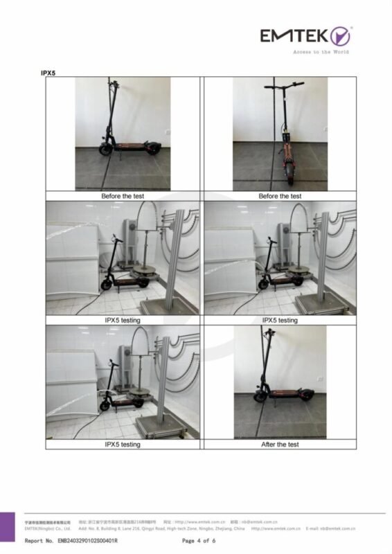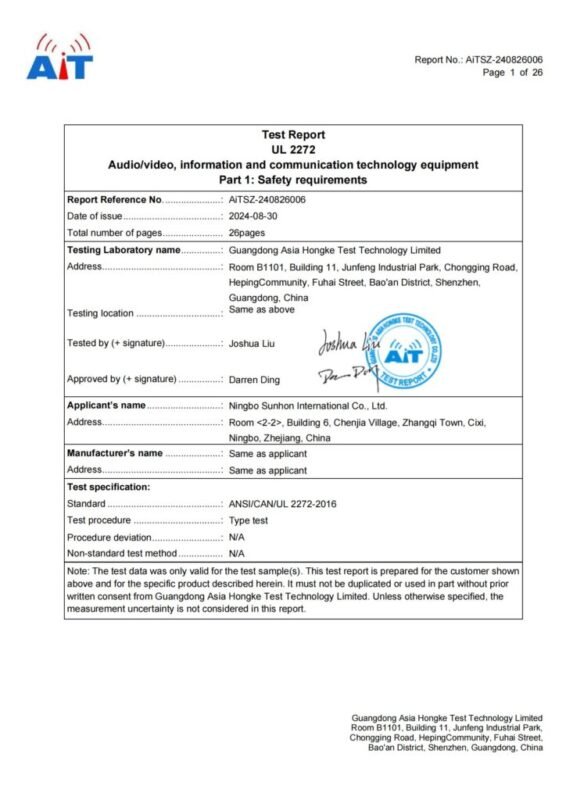 High-standard certifications from the U.S. and European countries, including EN17128:2020, CE, UL2272 test reports, RoHS, IPX5, and more.